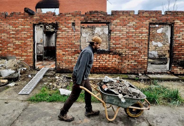 A volunteer clears rubble from a destroyed house in the village of Moshchunon near Kyiv on October 29 Sergei CHUZAVKOV AFP