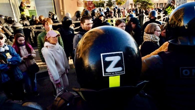 A police officer, with the 'Z' tactical insignia of Russian troops in Ukraine on his helmet, blocks the street in Saint Petersburg on September 24 - AFP