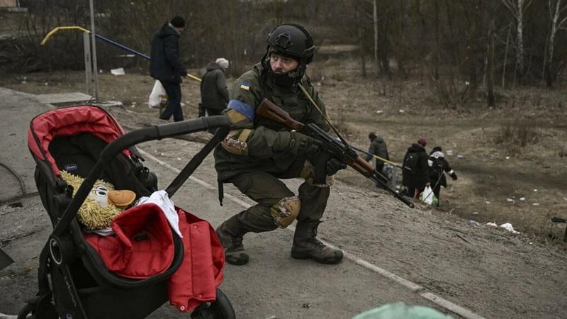 A Ukrainian serviceman takes cover as people evacuate the city of Irpin on March 13, 2022. (Aris Messinis AFP)