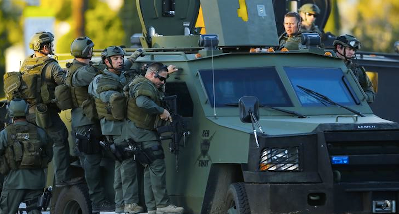 Police officers conduct a manhunt after a mass shooting in San Bernardino, California December 2, 2015. (REUTERS/Mike Blake)
