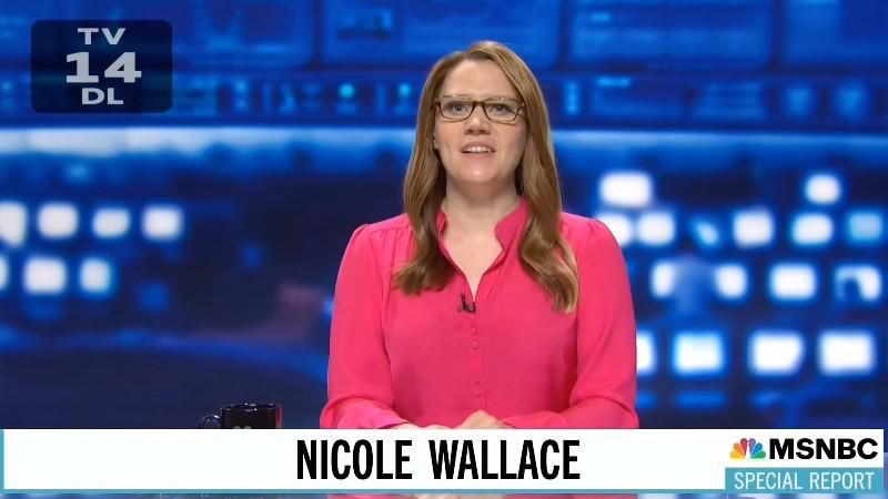 "Good evening, I am Nicolle Wallace and you're watching MSNBC news because you have nowhere else to place your anger," Kate McKinnon said. "Tonight, political fallout from the recent January 6th subpoenas, updates on the Russian helicopter taken down by Ukraine plus a nationwide shortage of baby formula."