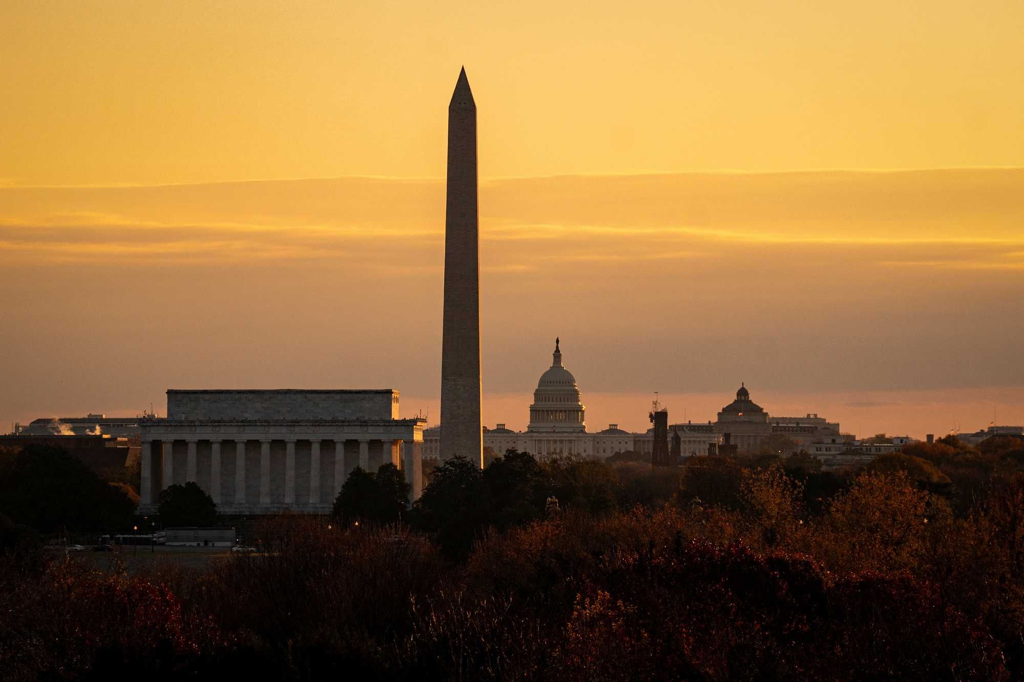 The sun rises behind the Lincoln Memorial, Washington Monument, and U.S. Capitol in Washington, D.C., U.S., seen from Arlington, Virginia on Nov. 12, 2025. REUTERS/Al Drago
