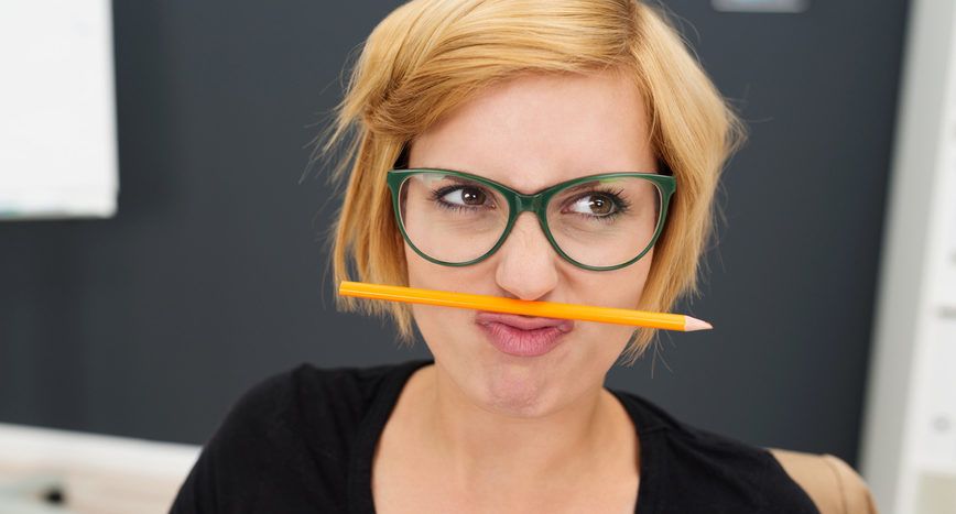 Macro Young Pretty Woman Putting Pencil Between Nose and Lip at Office via Shutterstock.com