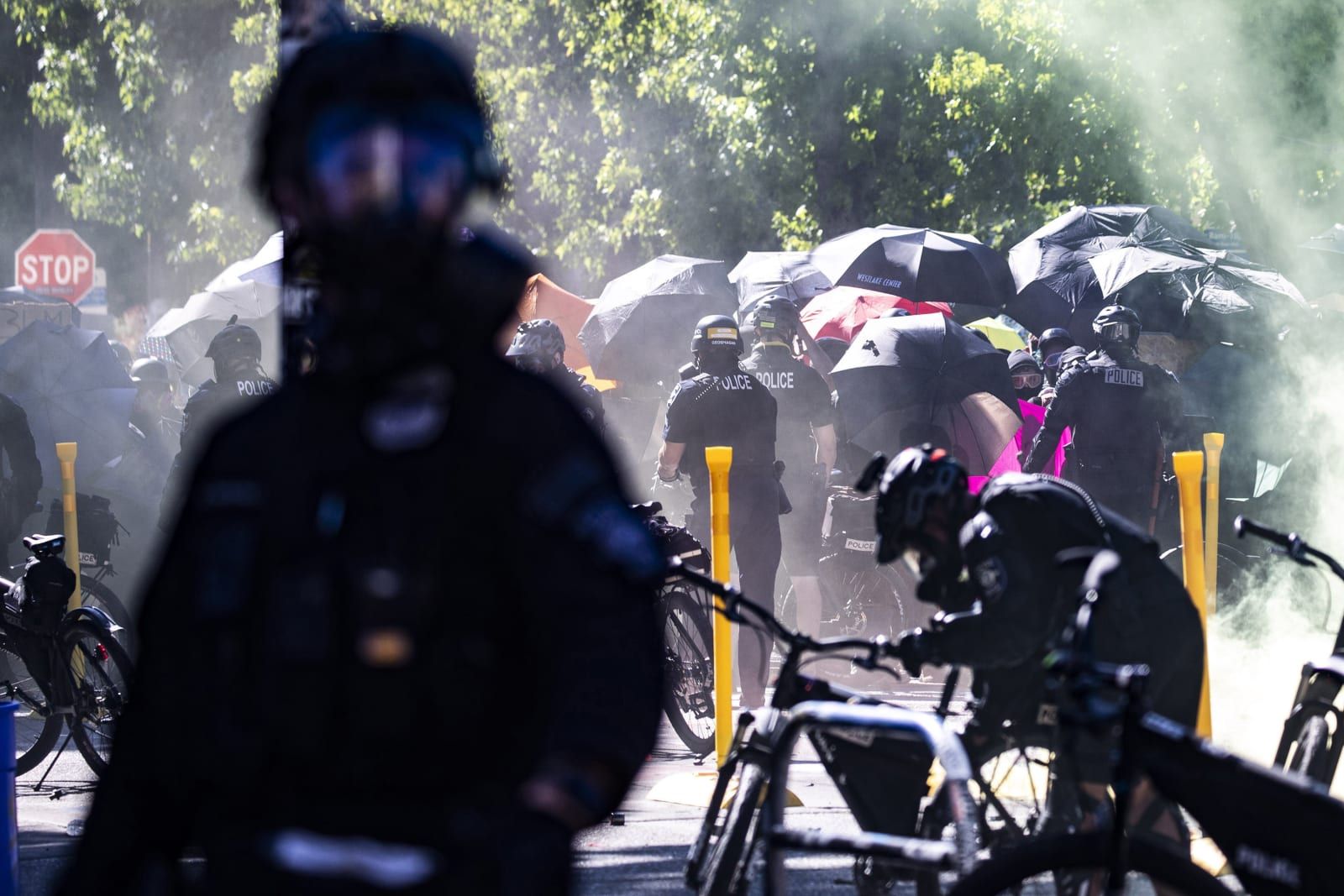Police use a chemical spray to push protesters west on Pine Street in Seattle's Capitol Hill neighborhood as planned protests for a "Youth Day of Action and Solidarity with Portland" on July 25, 2020. - The Seattle Times/Seattle Times/TNS