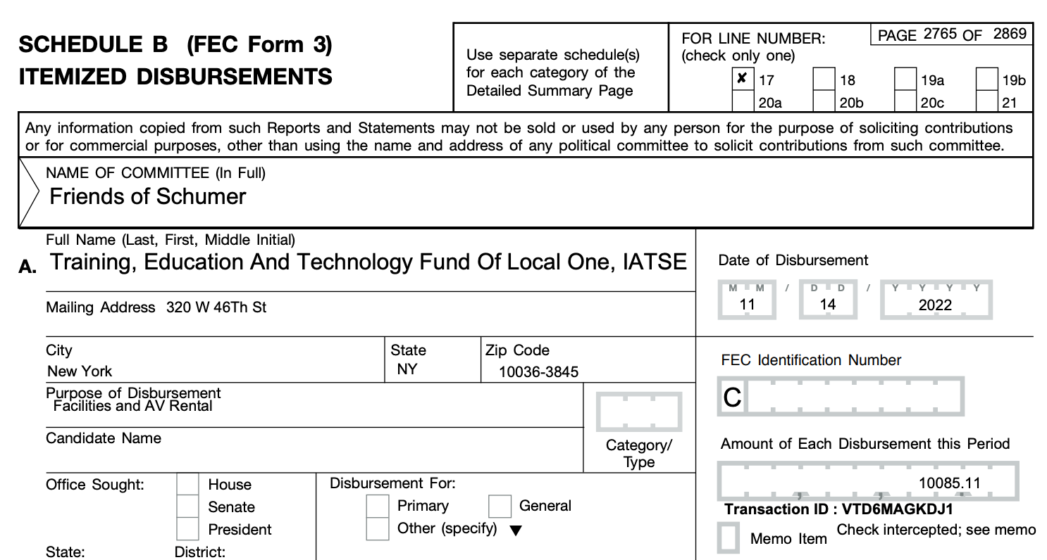 The check, intended to pay a campaign "facilities and AV rental" bill, "was stolen after it was mailed and was fraudulently cashed by someone other than the intended recipient," Friends of Schumer campaign treasurer Constantine Dimas wrote the FEC.