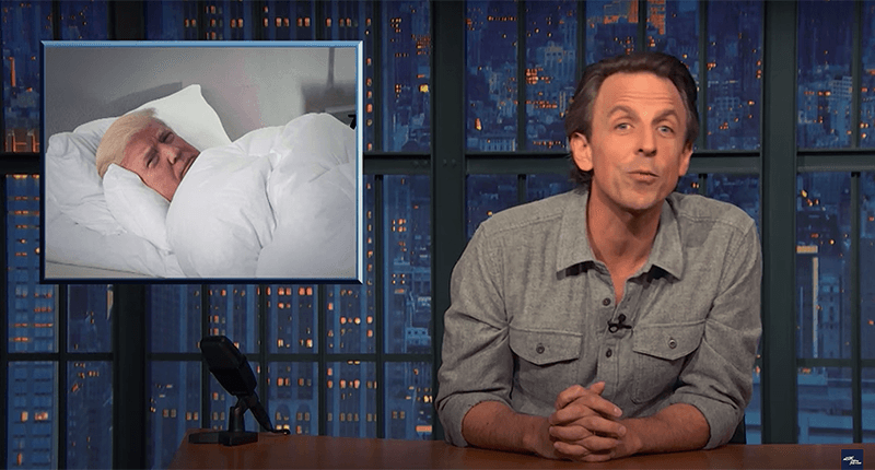 "Two weeks for a man who clearly loves talking to cameras. I mean, what's going on?" Meyers asked. "I'm guessing someone has to crack open his bedroom door every day at two in the afternoon and say to a lump of blankets, 'Mr. President? Mr. President, do you want to talk to the American people today?'"