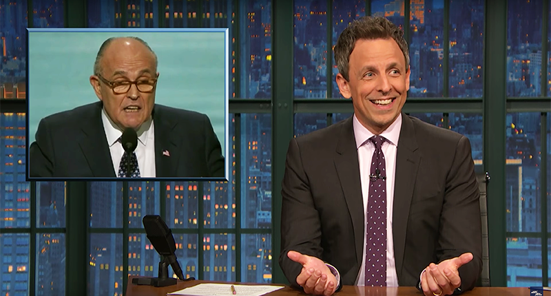 Calling Giuliani the "Mulberry Street Dracula," the comedian noted that in the first Fox News interview, Sean Hannity didn't even ask about the payment to Stormy Daniels or the dossier about Trump's ties to Russia. Giuliani "went out of his way to bring it up. All he had to do to not undercut Trump was to not say that the president repaid the money." Oops. "You cracked under no pressure," Meyers said.