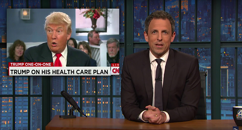 Republican presidential candidates all want to change Obamacare, they just have no idea how to do it. Monday night, Seth Meyers mocked Donald Trump for advocating scrapping Obamacare and replacing it with.... "something." He's not really sure what, but it'll certainly be.... "something."