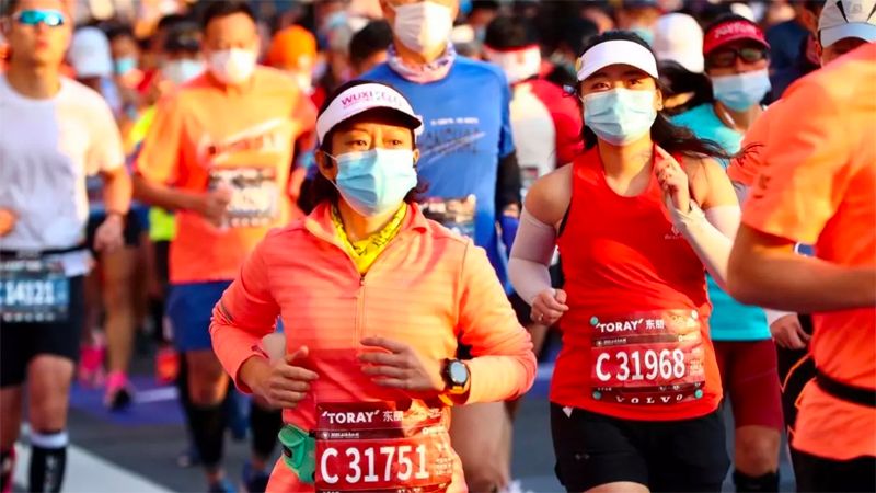 Bucking that trend, the Shanghai marathon went ahead under sunny skies following several days of rain, and with virus prevention measures in place to thwart infections.