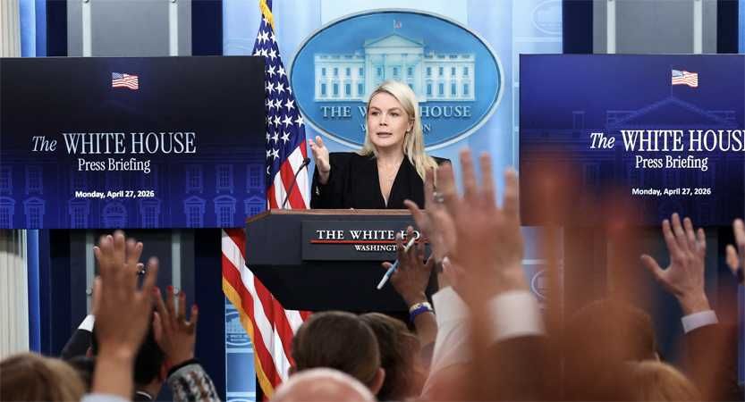 White House press secretary Karoline Leavitt takes questions from media as she holds a briefing at the White House in Washington, D.C., U.S., April 27, 2026. REUTERS/Kevin Lamarque