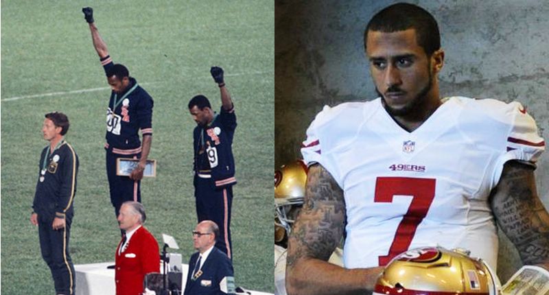Tommie Smith, John Carlos at 1968 Olympics (public domain), Colin Kaepernick (Facebook)