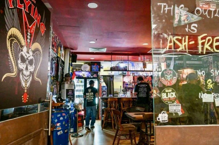 A sign over the entrance bears the venue's mantra: "Beer, Pizza, Metal".