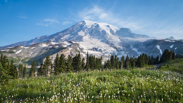 An active volcano, Mount Rainier rises 14,410 feet (4,392 meters) above sea level and dominates the Seattle skyline.