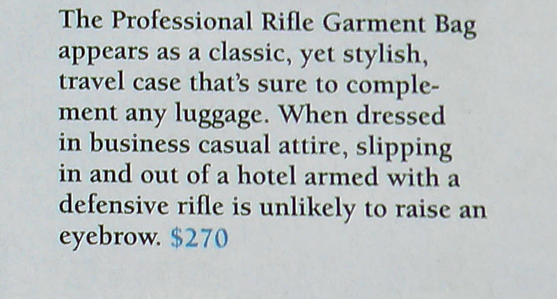 Managing editor Chris Mudgett wrote a four-page story hyping a rifle bag of a "discreet nature" that "appears as a classic, yet stylish travel case."