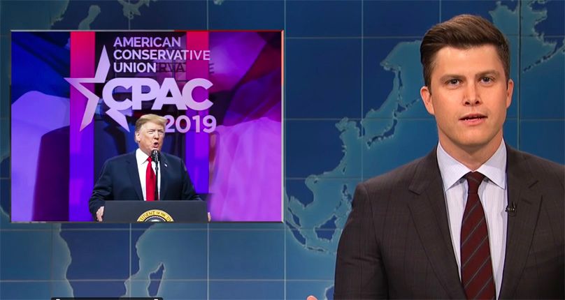 Saturday Night Live's Weekend Update was all over Donald Trump's frantic and overly long speech at CPAC, with bewildered host Colin Jost watching the president hug an American flag and wondering aloud, "What the hell was that?"