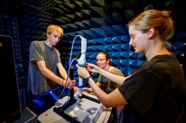 Students from the University of Nebraska work on a small surgical robot called spaceMIRA, before its test on the ISS (Craig Chandler/AFP)