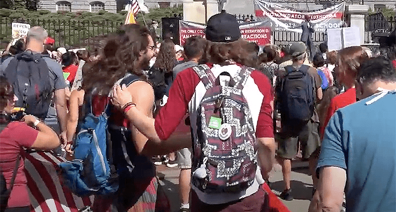 A protest against the flu shot in Boston, Massachusetts may ultimately become a super-spreader event after a speaker urged the audience to hug each other despite not wearing masks.