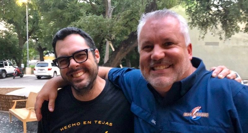 Texas AG spokesman Marc Rylander poses for a recent photo with Aaron Franklin of Franklin BBQ in Austin/Screenshot