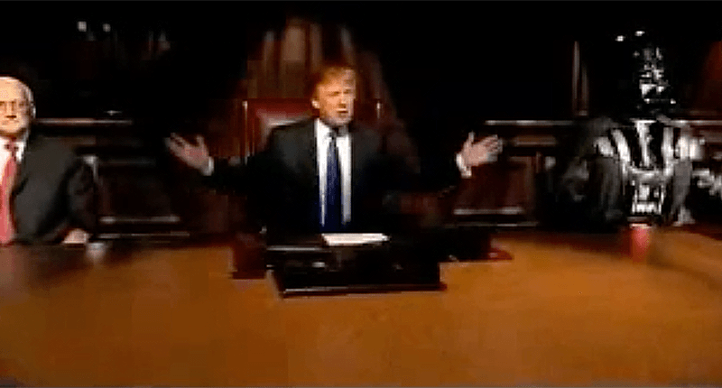 As part of a promotion, Trump sat in his signiture boardroom with Trump Organization VP George Ross and Vader himself. Across the table sat five stormtroopers.