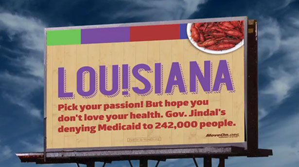 The billboard reads, “LOU!SIANA, Pick your passion! But hope you don’t love your health. Gov. Jindal’s denying Medicaid to 242,000 people.” a reference to the governor's refusal accept over a billion dollars in federal funds to expand the state’s Medicaid program.