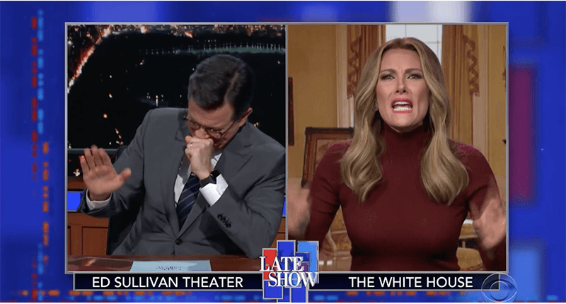 "Late Show" host Stephen Colbert tried to remain serious while he was speaking with fake first lady Melania Trump, who was gearing up for the White House Thanksgiving. But when the first lady took a serious turn, Colbert broke into hysterics.