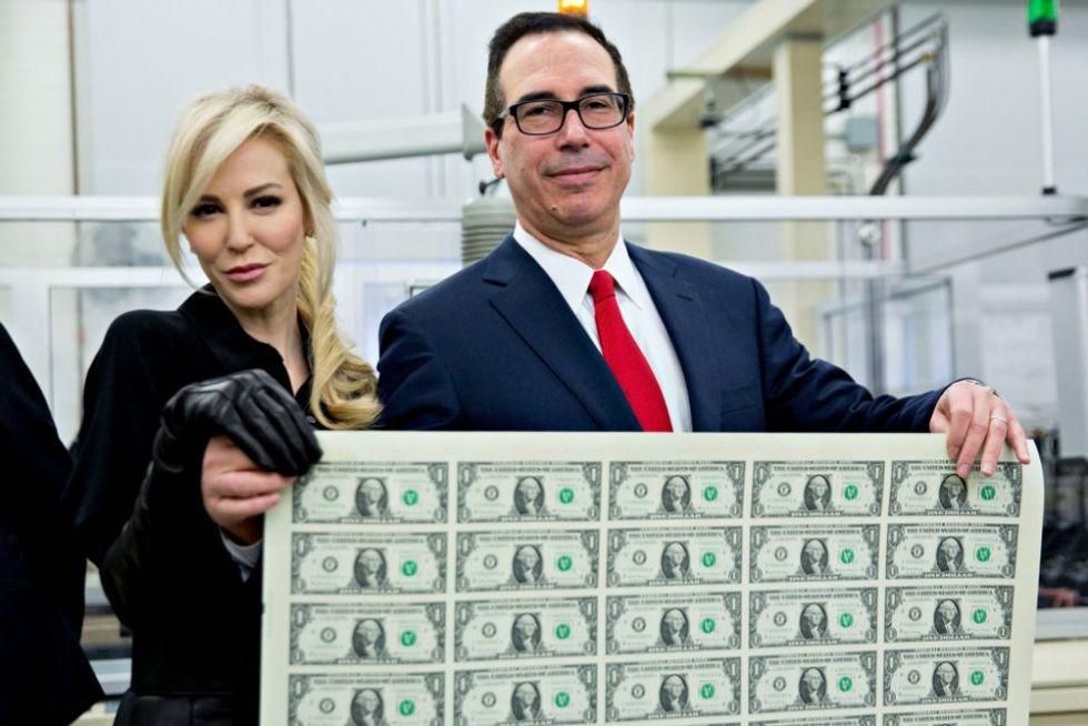 Treasury Secretary Steve Mnuchin poses with his wife Louise Linton while holding a sheet full of dollars (Twitter photo).