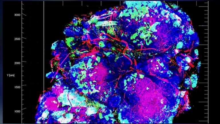 Tumors contain multiple different types of cancer cells with unique genetic mutations. This image shows a variety of pancreatic cancer cell clusters, each of a different color, within a tumor. Ravikanth Maddipati, Abramson Cancer Center at the Univ. of Pennsylvania, National Cancer Institute, National Institutes of Health via Flickr, CC BY-NC