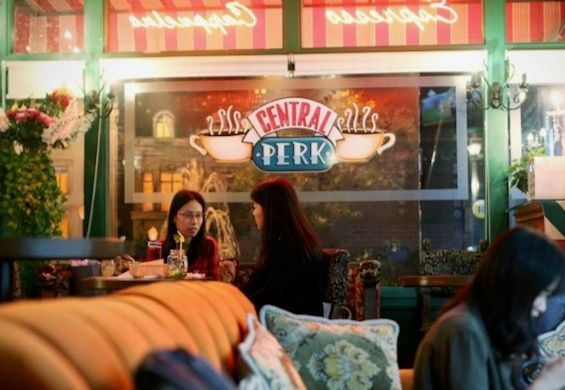 The Shanghai coffee shop features 'Central Perk's' signature window logo, big orange couch, and a TV that loops episodes all day