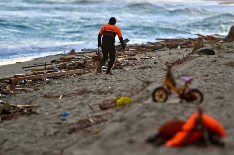 Weeping women were led among the rows of coffins laid out in a sports hall in the southern Italian seaside town of Crotone, some kneeling to pray quietly, while others howled in grief.
