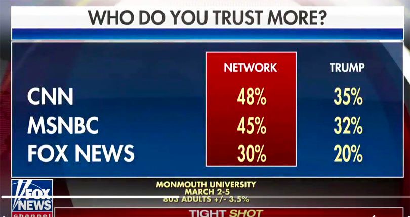 Speaking with pollster Frank Luntz about Donald Trump's Twitter habits, with Luntz calling the president's use of "fake news" detrimental to his cause, Kurtz brought up a recent poll from Monmouth University on the trustworthiness of news outlets compared to the trustworthiness of Donald Trump.