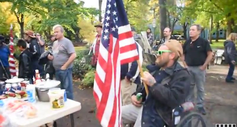 A group of Bundy supporters set up camp in a park across from the courthouse, waving flags, barbecuing, and milling around only to be confronted by protesters representing local group "Don't Shoot Portland."
