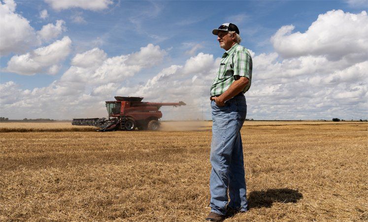 Dennis Schoenhals stands as a combine harvester is used on wheat in a field at his farm in Kremlin, Oklahoma, U.S., June 12, 2025. REUTERS/Nick Oxford