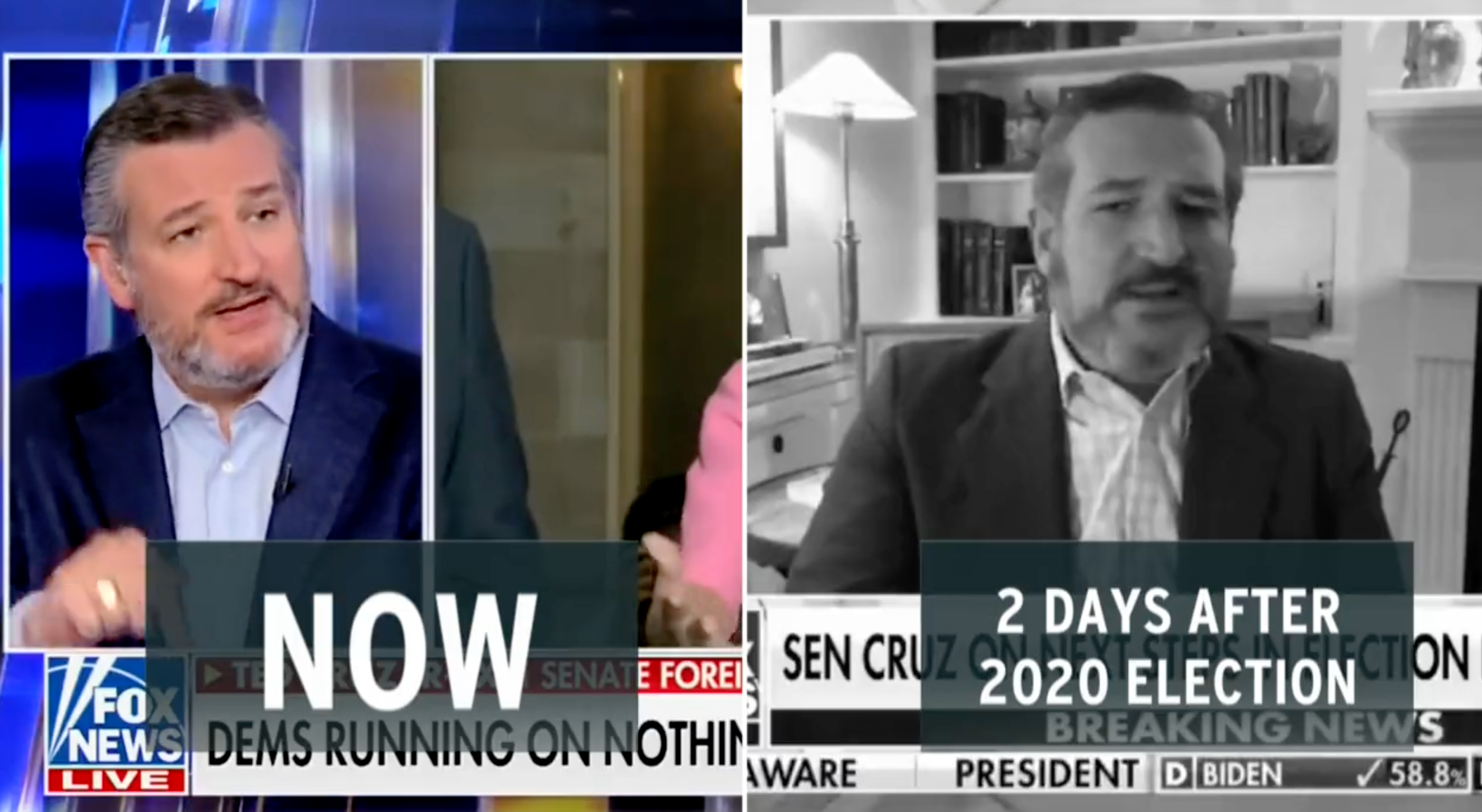 Two days after the 2020 election, Cruz said of Democrats, "They are setting the stage to potentially steal an election." That false assertion is immediately followed by Cruz accusing House Speaker Nancy Pelosi (D-Calif.) of "already screaming" that the 2022 midterm elections are going to be stolen by Republicans.