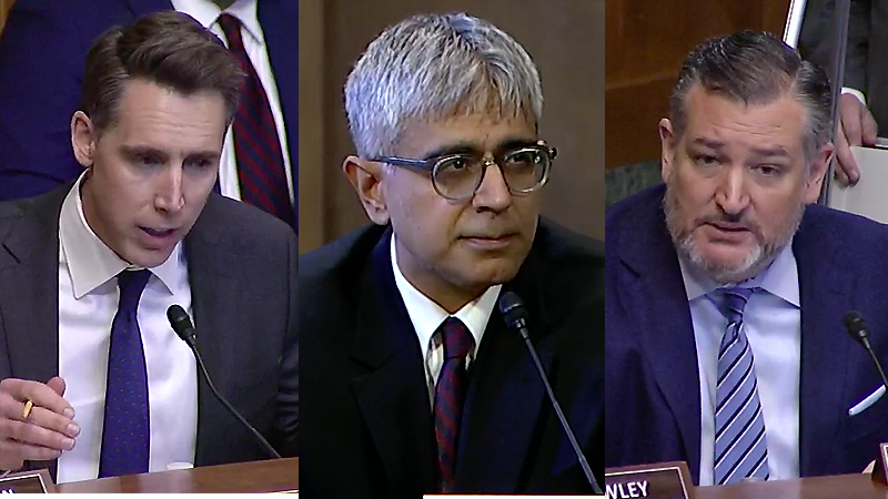 Sen. Josh Hawley (R-MO), judicial nominee Adeel Abdullah Mangi, and Sen. Ted Cruz (R-TX) (Photos: Screen capture via Senate Judiciary Committee hearing)