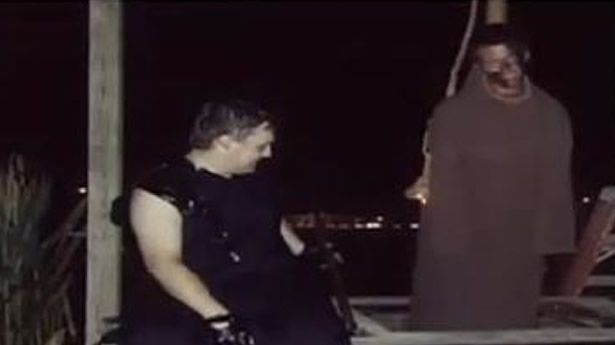 A photograph from a Halloween corn-maze in Tennessee is causing controversy on social media. The image is entitled "Hung up," and features a white man stringing up what appears to be an African-American child with a noose. The child, however, is actually white and wearing blackface.