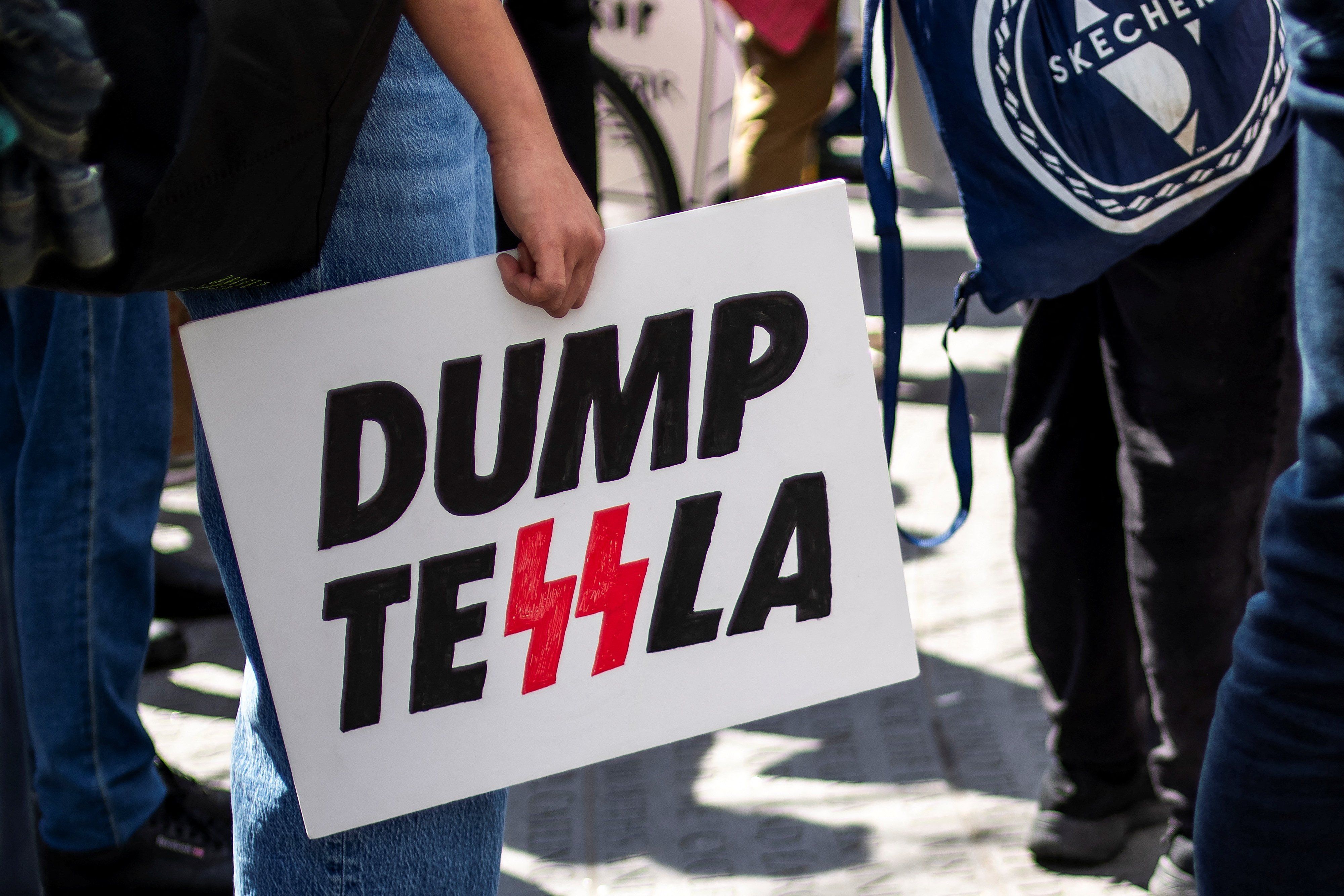 People take part in a protest against Tesla and its CEO Elon Musk outside a Tesla store in New York City, U.S. March 29, 2025. REUTERS/Eduardo Munoz