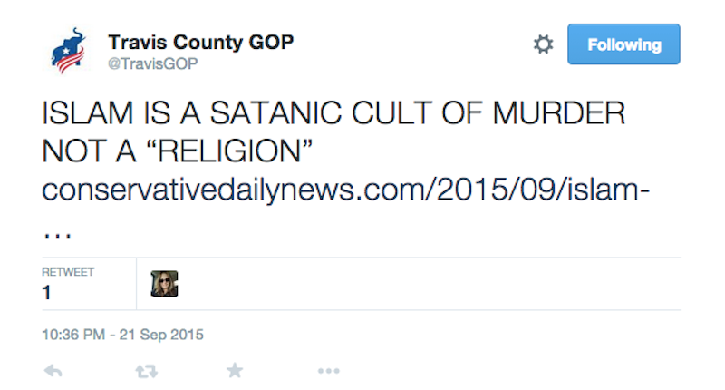 The Travis County GOP promoted the Conservative Daily News post, "Islam is a Satanic Cult of murder, not a ‘religion,’" late Monday but apparently deleted it by late Tuesday morning, reported the Texas Freedom Network.