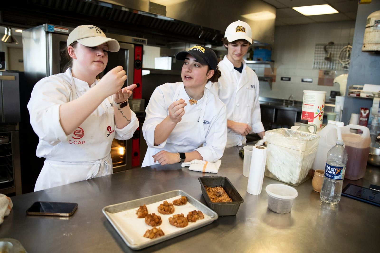 Students Natalie Mrak, Isabella Gigliotti, and Chris Buck work on a creating a baby food product using apples at the Drexel Food Lab in Philadelphia. - Monica Herndon/The Philadelphia Inquirer/TNS