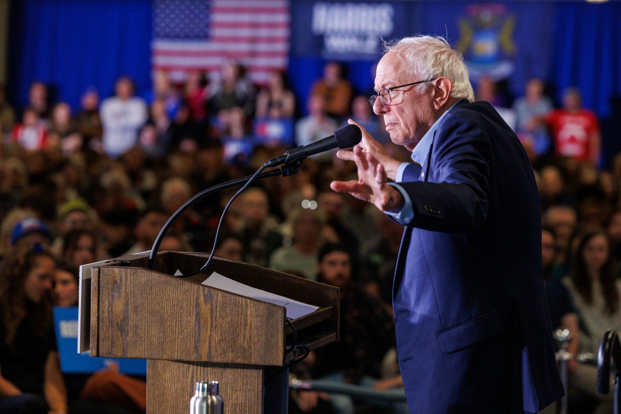 U.S. Sen. Bernie Sanders, I-Vt., campaigns for Vice President Kamala Harris in Saginaw, Mich., on Oct. 5, 2024. (Photo by Andrew Roth/Michigan Advance)