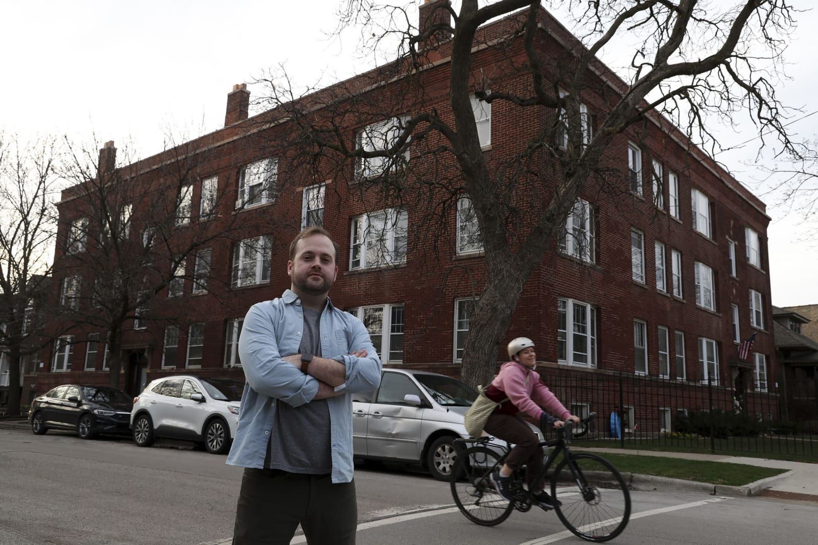 Alex Hardaway, who wrote a song about all of his neighbors in his 15- unit apartment building during the depths of the COVID-19 pandemic, is seen outside his Andersonville home on April 5, 2023. - Terrence Antonio James/Chicago Tribune/TNS