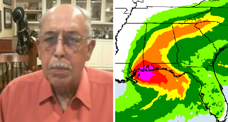 Composite image of Russel Honoré on MSNBC (screengrab) and NOAA rainfall predictions for Hurricane Sally.