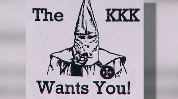 The fliers were distributed by the Loyal White Knights of the Ku Klux Klan. Some were in rock-filled baggies, others were attached to residents' doorknobs. This is the second such campaign initiated by the Loyal White Knights branch of the KKK in the past month.