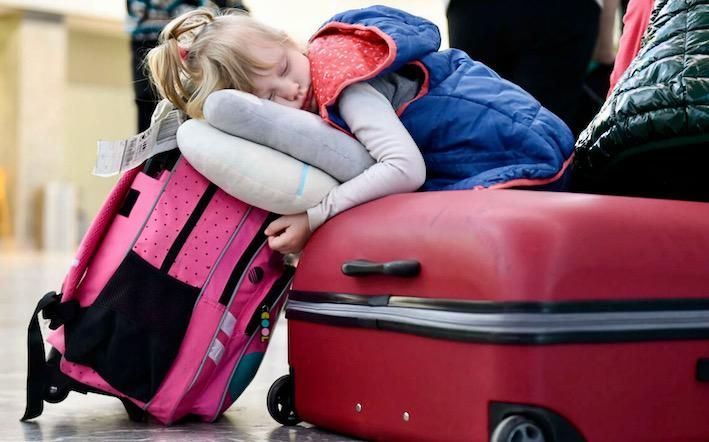 Three-year-old Anna Kuts sleeps on a suitcase after arriving with her family at the Tijuana, Mexico airport, where an army of volunteers is helping Ukrainian refugees near the end of their long voyage to the United States Patrick T. FALLON AFP
