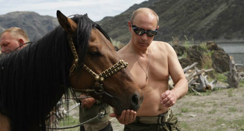Russian President Vladimir Putin, shirtless, feeding a horse. Image via Kremlin archives.