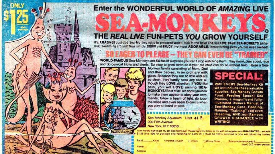 When I wasn't being educated about the deficiencies of the human body in comic book ads, I was being urged to add some exotic new pets to replace the family goldfish in our aquarium. At one point, I believe nearly every kid in my neighborhood had sent away for sea monkeys. It was easier to convince a parent buy a "bowl of happiness" than to get the puppy you really wanted, so a lot of parents caved to the requests. Sea Monkeys arrived by mail. The instructions were to "prep" the water with special powder, wait 24 hours and then drop in the Sea Monkey eggs. Soon thereafter, the water would be full of squirming, tiny creatures. Turns out that sea monkeys were brine shrimp, and they weren't all that interesting. The lifespan for the creatures wasn't very long, so new sea monkeys would have to be ordered to replace them.