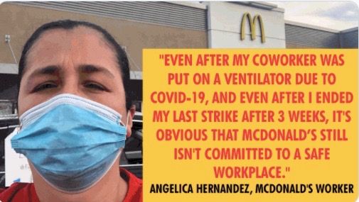Employees and strike organizers at the fair wage advocacy group Fight for $15 are demanding hazard pay during the pandemic of "$15X2," paid sick leave, sufficient protective gear for workers, and company-wide policy of closing a restaurant for two weeks when an employee becomes infected, with workers being fully paid.