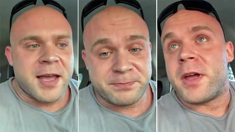 The man, wearing a T-shirt with an upside down American flag, claimed that the Secretary of Defense sent a text-message to everyone on active duty saying "by 10 AM you have to go get the magic potion or you're going to get court marshaled."