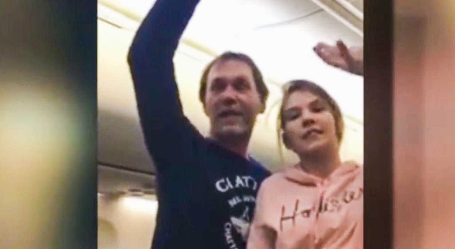"Happy flight home -- hope you stay there," he said to passengers who were filming him on their phones as he gathered his bags, while the woman he was with flipped them the middle finger. "Hey, I'll come back you'll be gone!"