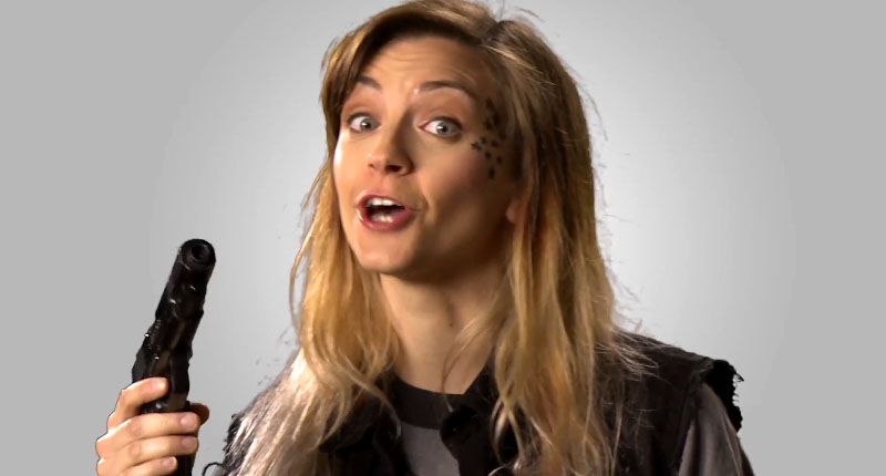 The Funny or Die video opens with a young woman and a young man facing the camera, dressed in black, sporting tattoos and powerful handguns.