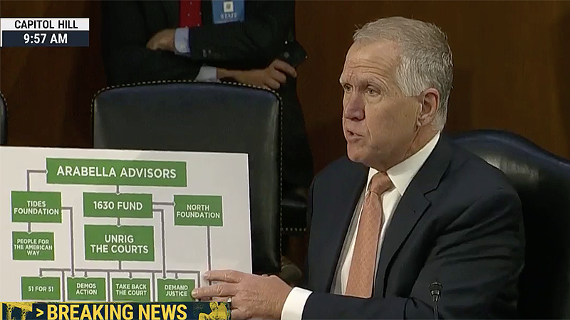 Tillis then linked Arabella as a donor to the 1630 Fund, which helps fund activists for everything from the environment to social justice. He then branched off into other groups funded by the groups that are funded by the Arabella Advisors. So, Arabella funded the 1630 Fund, which gave money to the Unrig the Courts organization, which then worked with a group called "Demand Justice" that Tillis has an issue with.
